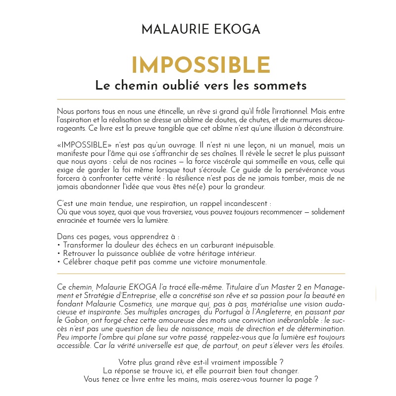 Pour vous remercier de votre engagement précoce, toute commande de deux exemplaires d’IMPOSSIBLE sera accompagnée d’une paire de faux cils signature Malaurie Cosmetics et d’un marque-page inspirant (idéal pour un cadeau !).